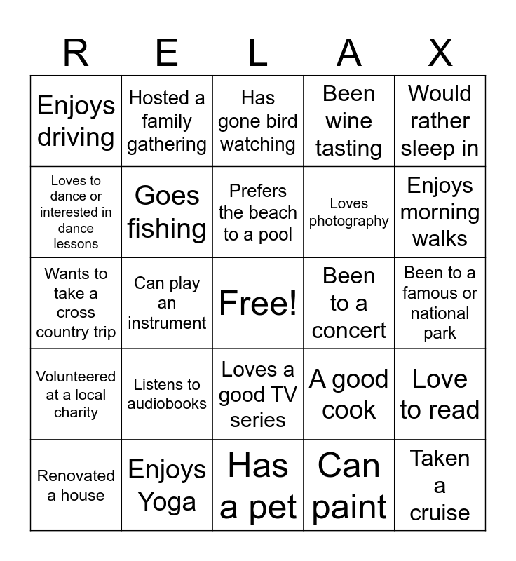 This bingo card has a free space and 34 words: Enjoys golfing, Can paint, Taken a 10+ hour road trip, Prefers a pool to the beach, Volunteered at a local charity, Goes fishing, Would rather sleep in, Renovated a house, Hosted a family gathering, Started a garden, Prefers the beach to a pool, Has gone bird watching, Has social media, Can play chess, Been to a concert, Enjoys morning walks, Enjoys Yoga, Wants to take a cross country trip, Listens to audiobooks, A good cook, Loves a good TV series, Written a blog/book, Enjoys driving, Been to a famous or national park, Has a pet, Taken a cruise, Been wine tasting, Regularly works out, Loves photography, Loves to dance or interested in dance lessons, Been to a museum, Can play an instrument, Love to read and Traveled to a different country.