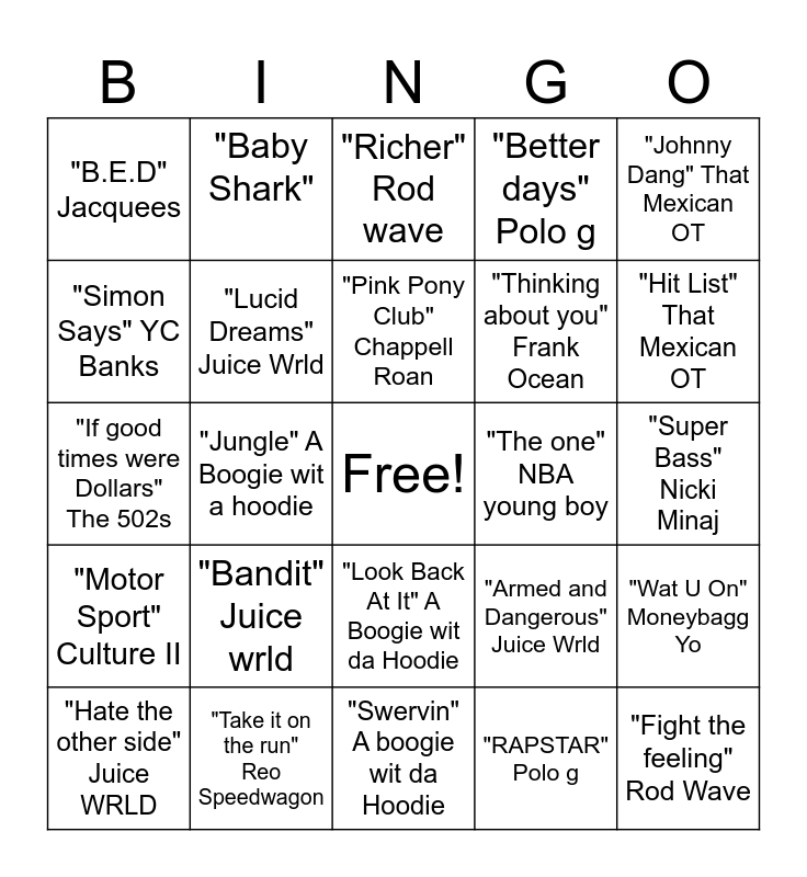 This bingo card has a free space and 24 words: "Bandit" Juice wrld, "Take it on the run" Reo Speedwagon, "Pink Pony Club" Chappell Roan, "Hate the other side" Juice WRLD, "Johnny Dang" That Mexican OT, "B.E.D" Jacquees, "Simon Says" YC Banks, "Baby Shark", "The one" NBA young boy, "Look Back At It" A Boogie wit da Hoodie, "Thinking about you" Frank Ocean, "If good times were Dollars" The 502s, "Armed and Dangerous" Juice Wrld, "Wat U On" Moneybagg Yo, "Lucid Dreams" Juice Wrld, "RAPSTAR" Polo g, "Super Bass" Nicki Minaj, "Richer" Rod wave, "Hit List" That Mexican OT, "Jungle" A Boogie wit a hoodie, "Fight the feeling" Rod Wave, "Motor Sport" Culture II, "Better days" Polo g and "Swervin" A boogie wit da Hoodie.