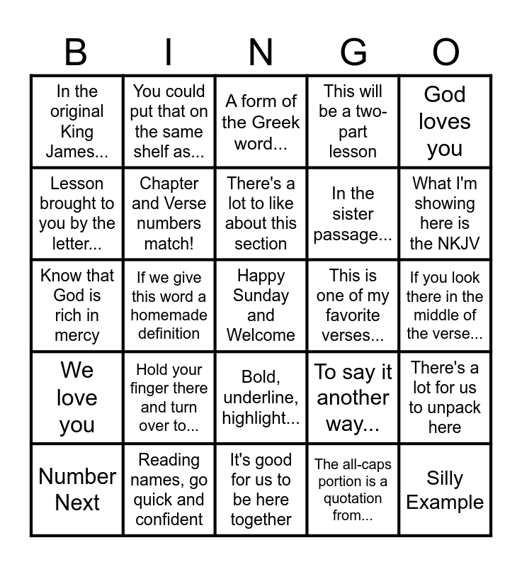 This bingo card has a free space and 24 words: Number Next, Hold your finger there and turn over to..., There's a lot to like about this section, The all-caps portion is a quotation from..., God loves you, In the original King James..., You could put that on the same shelf as..., A form of the Greek word..., This is one of my favorite verses..., If you look there in the middle of the verse..., Know that God is rich in mercy, Chapter and Verse numbers match!, To say it another way..., There's a lot for us to unpack here, Lesson brought to you by the letter..., Reading names, go quick and confident, It's good for us to be here together, This will be a two-part lesson, What I'm showing here is the NKJV, We love you, If we give this word a homemade definition, Bold, underline, highlight..., In the sister passage... and Silly Example.