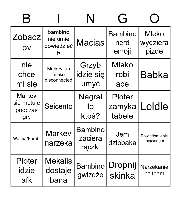 This bingo card has a free space and 24 words: Markev narzeka, Mekalis dostaje bana, Grzyb idzie się umyć, Pioter idzie afk, Mleko wydziera pizde, Zobacz pv, nie chce mi się, bambino nie umie powiedzieć R, Pioter zamyka tabele, Bambino zaciera rączki, Mleko robi ace, Markev sie mutuje podczas gry, Jem dziobaka, Powiadomienie messenger, Markev lub mleko disconnected, Dropnij skinka, Loldle, Macias, Babka, Seicento, Narzekanie na team, Waima/Bambi, Bambino nerd emoji and Bambino gwiżdże.