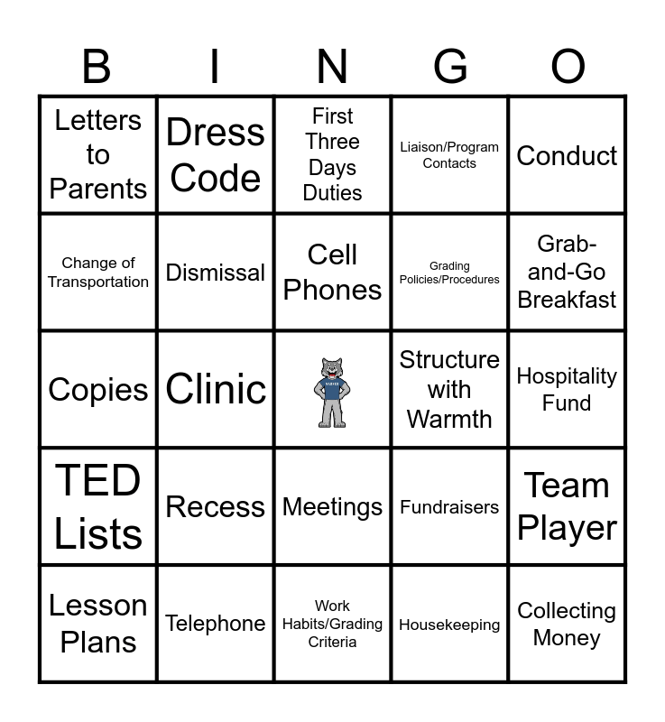 This bingo card has a free space and 75 words: Morning Duties, Afternoon Duties, First Three Days Duties, Staff Hours, Student Hours, Tutoring, Animals, Announcements, Badges, Blue Tags/ Stickers, Bus Referrals, Cafeteria Guidelines, Cell Phones, Change of Transportation, CPS, Clinic, Closing the Gap, Collecting Money, Communication to Parents, Conduct, Conflict of Interest, Copies, Dismissal, Dress Code, Liaison/Program Contacts, ARD/IEP Meetings, Arrival/Departure of Students/ Staff, Attendance, Electrical Appliances, Email, Facebook, First Day of School Goals, FMNV, Fundraisers, Grab-and-Go Breakfast, Grading Policies/Procedures, Homework Policy, Honor Roll, Hospitality Fund, Housekeeping, Instruction, Interschool Mail, Laminating, Lanyards, Late to Work, Leaving Early, Lesson Plans, Letters to Parents, Lounge, Mailboxes, Make-up Work, Meetings, Moment of Silence, Movies, Online Grades, Parking, Planning, Pledge, Progress Reports, Purchases, Recess, Restrooms, Social Networks, SpEd/504 Parent Requests for Testing, Staff Member Children, Structure with Warmth, Subpoena, Substitute Lessons, Teacher Communication, Team Player, TED Lists, Telephone, Textbooks, Work Habits/Grading Criteria and Written Correspondence.