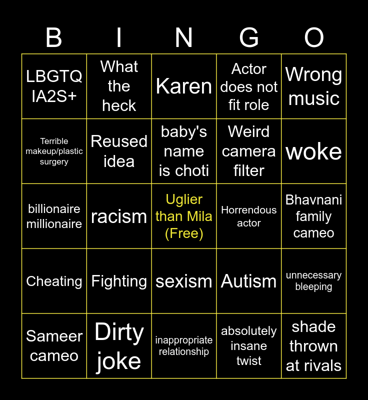 This bingo card has a free space and 29 words: Sameer cameo, AI altered thumbnail, racism, fatphobia, LBGTQ IA2S+, Karen, Reused idea, Fighting, Horrendous actor, Dirty joke, Bhavnani family cameo, shade thrown at rivals, inappropriate relationship, absolutely insane twist, woke, based, sexism, Cheating, Wrong music, billionaire millionaire, Autism, Homeless or dirty, Weird camera filter, Terrible makeup/plastic surgery, Actor does not fit role, What the heck, unnecessary bleeping, baby's name is choti and creep.