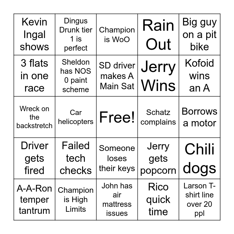 This bingo card has a free space and 52 words: Photo finish, Larson T-shirt line over 20 ppl, Last to top 5 in A feature, John has air mattress issues, Failed tech checks, Dietrich twitter drama, Dingus Drunk tier 1 is perfect, Catches a t-shirt, 3 flats in one race, Non affiliated driver wins prelim feature, Sheldon has NOS 0 paint scheme, Macedo is spotted on his scooter, Chili dogs, Jerry gets popcorn, Jerry gets track pizza, One day over 100, SD driver makes A Main Sat, Schatz complains, A feature with 0 cautions, Big guy on a pit bike, Car helicopters, Rico quick time, Kevin Ingal shows, Jerry Wins, Eric 1st pick, Gravel complains, Wreck in turn 1, Driver leads all laps, Kofoid wins an A, Larson flies in to make a race, Schuchart wins Capitani Classic, Rain Out, Fight in the pits, Gus sighting, Pella sighting, Champion is WoO, Champion is High Limits, Champion is no affiliation, Debris on the track, Rico to the podium, Fire extinguishers used, Borrows a motor, Driver gets fired, Steve Kinser sighting, Someone loses their keys, Brian Brown has a quick time, 5 cautions in one race, Wreck on the backstretch, Sheldon charges past 5 cars, Aussie on the podium, A-A-Ron temper tantrum and Last corner pass for the win.