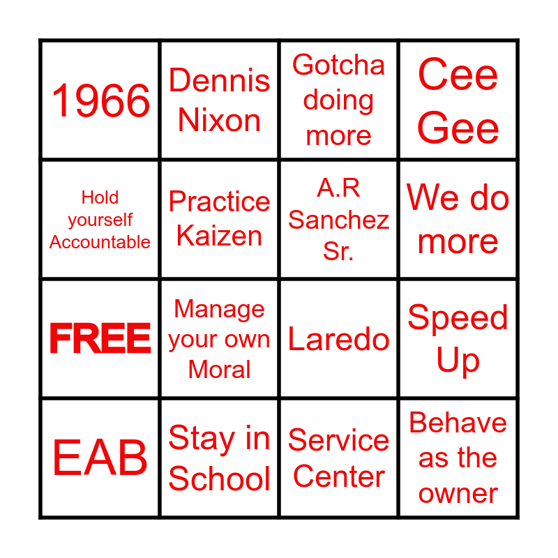 This bingo card has 20 words: Speed Up, Alter your own Expectation, Gotcha doing more, Commit fully to your Job, EAB, Hold yourself Accountable, Stay in School, 1966, FREE, Dennis Nixon, Manage your own Moral, Laredo, Practice Kaizen, Behave as the owner, A.R Sanchez Sr., Add Value, We do more, Cee Gee, Service Center and Tesoro.
