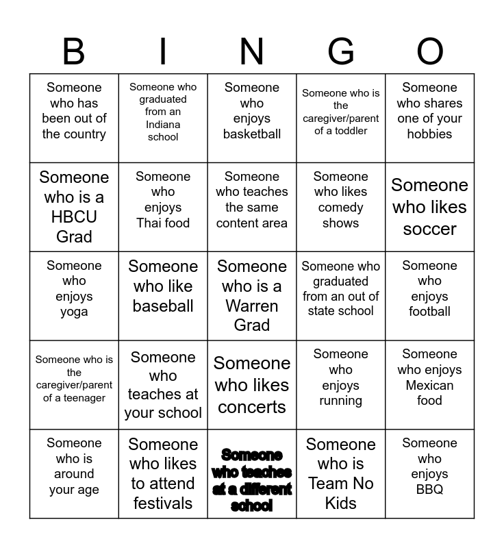 This bingo card has 25 words: Someone who teaches at your school, Someone who teaches at a different school, Someone who teaches the same content area, Someone who is around your age, Someone who shares one of your hobbies, Someone who has been out of the country, Someone who is a HBCU Grad, Someone who graduated from an Indiana school, Someone who graduated from an out of state school, Someone who likes concerts, Someone who likes comedy shows, Someone who enjoys yoga, Someone who enjoys running, Someone who enjoys Mexican food, Someone who enjoys Thai food, Someone who enjoys BBQ, Someone who enjoys football, Someone who enjoys basketball, Someone who likes soccer, Someone who like baseball, Someone who is a Warren Grad, Someone who likes to attend festivals, Someone who is the caregiver/parent of a teenager, Someone who is the caregiver/parent of a toddler and Someone who is Team No Kids.