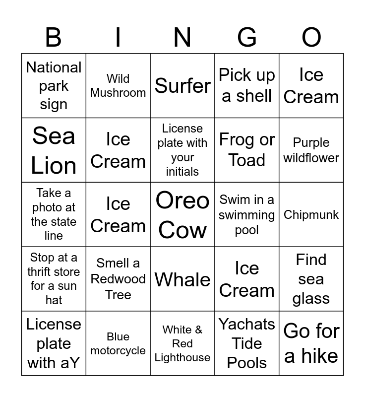 This bingo card has a free space and 35 words: Orange Car, Drive through a Tree, Wade in a tidepool, Ice Cream, Whale, Pick up a shell, Sea Lion, Eat Onion Rings, License plate with your initials, Swim in the ocean, Take a photo at the state line, Ice Cream, Eat waffles for breakfast, New York License plate, National park sign, Swim in a swimming pool, Yachats Tide Pools, Ice Cream, Stop at a thrift store for a sun hat, Go for a hike, Ice Cream, License plate with aY, Find sea glass, Blue motorcycle, Surfer, Purple wildflower, Seaweed, Giant Fern, Frog or Toad, Chipmunk, Starfish, White & Red Lighthouse, Smell a Redwood Tree, Wild Mushroom and Feather.