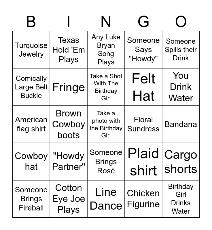 This bingo card has a free space and 39 words: Someone Says "Y'all", Black Cowboy Boots, Bolo Tie, Fringe, Someone Brings Fireball, Someone Brings Rosé, Take a Shot With The Birthday Girl, Paisley Print, Someone Spills their Drink, Cowboy hat, Brown Cowboy boots, Someone Says "Howdy", Birthday Girl Drinks Water, Bandana, Floral Sundress, "Howdy Partner", Drink out of a boot, Turquoise Jewelry, Someone Falls off a Hay Bale, Plaid shirt, Comically Large Belt Buckle, Line Dance, Felt Hat, You Drink Water, "Yeehaw", Birthday Speech, Karaoke Performance, Someone Changes Outfits, Straw Hat, Texas Hold 'Em Plays, Dolly Parton, Share a Favorite Memory of the Birthday Girl, Any Luke Bryan Song Plays, Cotton Eye Joe Plays, Chicken Figurine, Jorts, Cargo shorts, American flag shirt and Make the Birthday Girl Laugh.