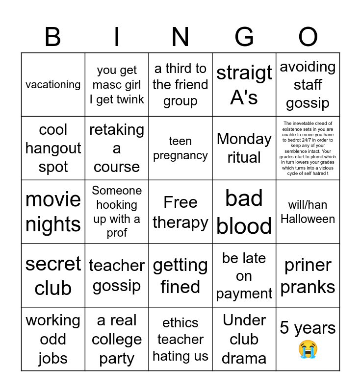 This bingo card has a free space and 24 words: teacher gossip, a real college party, teen pregnancy, working odd jobs, avoiding staff gossip, vacationing, cool hangout spot, you get masc girl I get twink, bad blood, getting fined, Monday ritual, movie nights, be late on payment, priner pranks, retaking a course, Under club drama, will/han Halloween, a third to the friend group, The inevetable dread of existence sets in you are unable to move you have to bedrot 24/7 in order to keep any of your semblence intact. Your grades dtart to plumit which in turn lowers your grades which turns into a vicious cycle of self hatred t, Someone hooking up with a prof, 5 years 😭, secret club, straigt A's and ethics teacher hating us.