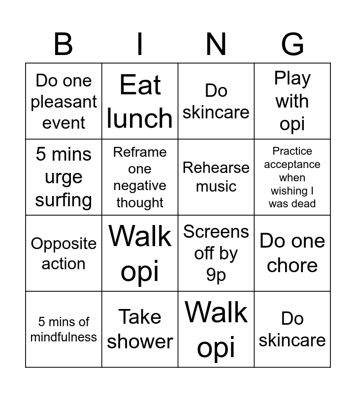 This bingo card has 16 words: Take shower, Do one chore, Do skincare, Do one pleasant event, Opposite action, Eat lunch, Screens off by 9p, Walk opi, 5 mins urge surfing, Reframe one negative thought, 5 mins of mindfulness, Play with opi, Walk opi, Practice acceptance when wishing I was dead, Rehearse music and Do skincare.