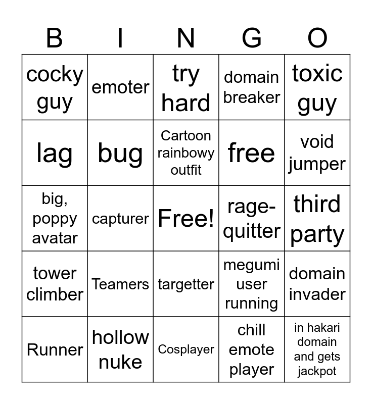 This bingo card has a free space and 25 words: Teamers, Cosplayer, Cartoon rainbowy outfit, Runner, toxic guy, cocky guy, lag, emoter, rage-quitter, targetter, free, big, poppy avatar, megumi user running, domain invader, bug, 1k player, third party, try hard, void jumper, capturer, in hakari domain and gets jackpot, hollow nuke, tower climber, domain breaker and chill emote player.