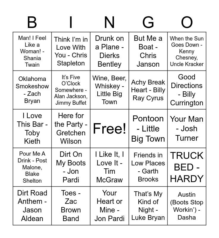 This bingo card has a free space and 50 words: I Had Some Help - Post Malone, Morgan Wallen, Austin (Boots Stop Workin’) - Dasha, You Proof - Morgan Wallen, Your Heart or Mine - Jon Pardi, Dirt On My Boots - Jon Pardi, Barefoot Blue Jean Night - Jake Owen, Think I’m in Love With You - Chris Stapleton, Dance Her Name - Cody Johnson, Oklahoma Smokeshow - Zach Bryan, Nine Ball - Zach Bryan, It’s Five O’Clock Somewhere - Alan Jackson, Jimmy Buffet, But Me a Boat - Chris Janson, TRUCK BED - HARDY, Friends in Low Places - Garth Brooks, The Booze Cruise - Blackjack Billy, Boot Scootin’ Boogie - Brooks & Dunn, Wine, Beer, Whiskey - Little Big Town, Pontoon - Little Big Town, She’s Country - Jason Aldean, When the Sun Goes Down - Kenny Chesney, Uncle Kracker, Here for the Party - Gretchen Wilson, That’s My Kind of Night - Luke Bryan, Man! I Feel Like a Woman! - Shania Twain, Achy Break Heart - Billy Ray Cyrus, Drinkin’ Problem - Midtown, Honky Tonk Badonkadonk - Trace Adkins, Good Directions - Billy Currington, Ladies Love Country Boys - Trace Adkins, Drunk on a Plane - Dierks Bentley, I Like It, I Love It - Tim McGraw, She Thinks My Tractor’s Sexy - Kenny Chesney, Save a Horse (Ride a Cowboy) - Big & Rich, Forever and Ever, Amen - Randy Travis, Play it Again - Luke Bryan, Toes - Zac Brown Band, Country Girl (Shake It For Me) - Luke Bryan, Why Don’t We Just Dance - Josh Turner, Tequila Makes Her Clothes Fall Off - Joe Nichols, One Margarita - Luke Bryan, Your Man - Josh Turner, Body Like a Back Road - Sam Hunt, Life is a Highway - Rascal Flatts, Chattahoochiee - Alan Jackson, Red Solo Cup - Toby Kieth, Dirt Road Anthem - Jason Aldean, I Love This Bar - Toby Kieth, A Bar Song (Tipsy) - Shaboozey, Starting Over - Chris Stapleton, Pour Me A Drink - Post Malone, Blake Shelton and One Man Band - Old Dominion.