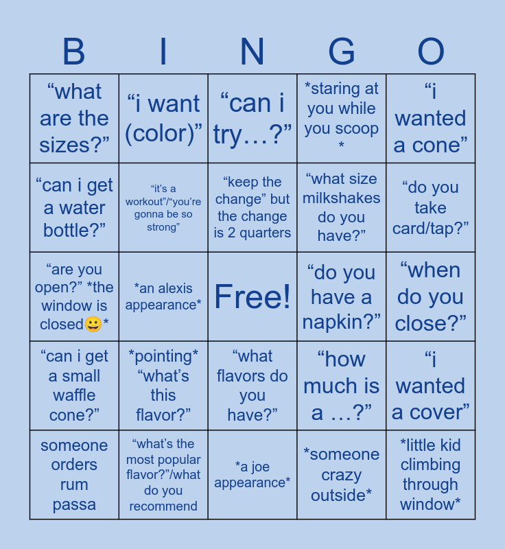 This bingo card has a free space and 24 words: someone orders rum passa, *pointing* “what’s this flavor?”, “keep the change” but the change is 2 quarters, *someone crazy outside*, “i wanted a cone”, “what are the sizes?”, “i want (color)”, “can i try…?”, “do you have a napkin?”, “when do you close?”, “are you open?” *the window is closed😀*, “it’s a workout”/“you’re gonna be so strong”, “how much is a …?”, “i wanted a cover”, “can i get a water bottle?”, “what’s the most popular flavor?”/what do you recommend, *a joe appearance*, *staring at you while you scoop *, “do you take card/tap?”, “can i get a small waffle cone?”, *an alexis appearance*, “what flavors do you have?”, “what size milkshakes do you have?” and *little kid climbing through window*.