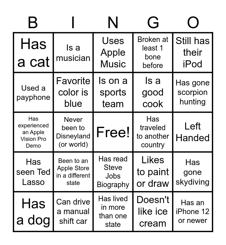 This bingo card has a free space and 24 words: Been to an Apple Store in a different state, Can drive a manual shift car, Is on a sports team, Has a dog, Still has their iPod, Has a cat, Used a payphone, Is a musician, Has traveled to another country, Has read Steve Jobs Biography, Is a good cook, Has experienced an Apple Vision Pro Demo, Likes to paint or draw, Has gone skydiving, Favorite color is blue, Doesn't like ice cream, Left Handed, Uses Apple Music, Has gone scorpion hunting, Never been to Disneyland (or world), Has an iPhone 12 or newer, Has seen Ted Lasso, Broken at least 1 bone before and Has lived in more than one state.