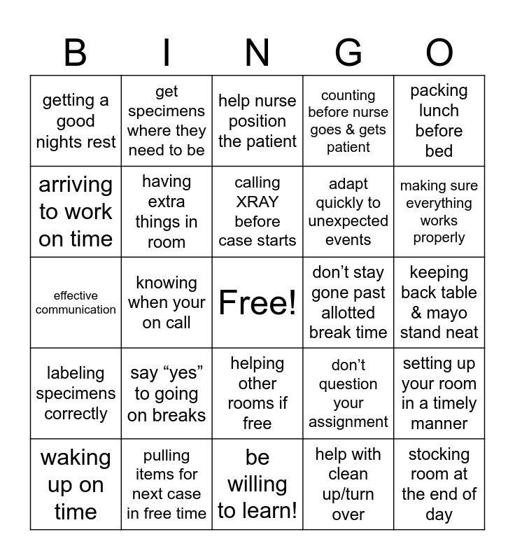 This bingo card has a free space and 24 words: say “yes” to going on breaks, pulling items for next case in free time, calling XRAY before case starts, waking up on time, packing lunch before bed, getting a good nights rest, arriving to work on time, get specimens where they need to be, don’t stay gone past allotted break time, helping other rooms if free, adapt quickly to unexpected events, effective communication, don’t question your assignment, setting up your room in a timely manner, having extra things in room, help with clean up/turn over, keeping back table & mayo stand neat, help nurse position the patient, making sure everything works properly, knowing when your on call, stocking room at the end of day, labeling specimens correctly, counting before nurse goes & gets patient and be willing to learn!.