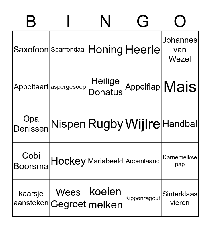 This bingo card has 40 words: Oma Denissen, Opa Denissen, gebreide sok, aspergesoep, Wees Gegroet, Mariabeeld, Heilige Donatus, Paulus van Overveld, Johannes van Wezel, Cobi Boorsma, Nispen, Heerle, Rugby, Handbal, Wijlre, Hockey, Voetbal, Saxofoon, Kweeperenjam, Honing, Karnemelkse pap, Kippenragout, Appelflap, Appeltaart, Huijbergen, Familieweekend, Gourmetten, Paaseieren zoeken, Sinterklaas vieren, Varken slachten, Eerste Communie, kaarsje aansteken, Audi, Aopenlaand, Mais, koeien melken, Studio Sport kijken, Heeroom, Sparrendaal and Koewacht.