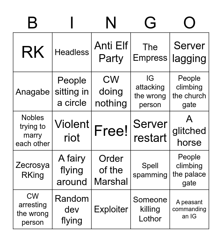 This bingo card has a free space and 24 words: A fairy flying around, Random dev flying, CW doing nothing, CW arresting the wrong person, Server lagging, RK, Anagabe, Headless, Server restart, Order of the Marshal, IG attacking the wrong person, Nobles trying to marry each other, Spell spamming, People climbing the palace gate, People sitting in a circle, Someone killing Lothor, A glitched horse, Anti Elf Party, People climbing the church gate, Violent riot, A peasant commanding an IG, Zecrosya RKing, The Empress and Exploiter.