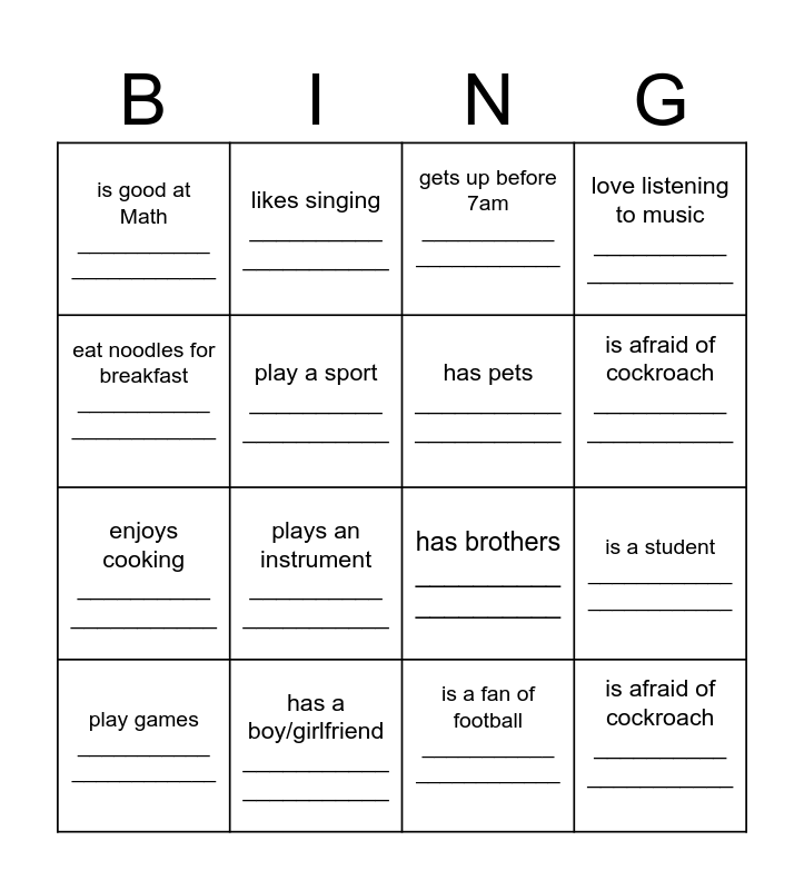This bingo card has 20 words: is a student ____________ ____________, doesn't like coffee ___________ ____________, gets up before 7am ___________ ____________, love listening to music __________ ___________, play games ___________ ____________, eat noodles for breakfast ___________ ____________, has a boy/girlfriend ___________ ___________, is good at Math ___________ ____________, enjoys cooking __________ ___________, likes singing __________ ___________, plays an instrument __________ ___________, has brothers __________ __________, play a sport __________ ___________, is afraid of cockroach __________ ___________, has pets ___________ ___________, is a fan of football ___________ ____________, is afraid of cockroach __________ ___________, love listening to music __________ ___________, is a fan of football ___________ ____________ and has pets ___________ ___________.