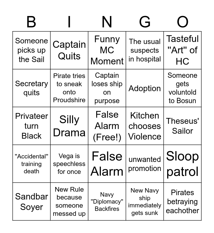 This bingo card has a free space and 24 words: Vega is speechless for once, New Rule because someone messed up, Captain loses ship on purpose, Sandbar Soyer, Tasteful ''Art'' of HC, Someone picks up the Sail, Secretary quits, Captain Quits, Kitchen chooses Violence, False Alarm, Adoption, Privateer turn Black, unwanted promotion, Sloop patrol, Pirate tries to sneak onto Proudshire, New Navy ship immediately gets sunk, Theseus' Sailor, Funny MC Moment, Someone gets voluntold to Bosun, Silly Drama, Pirates betraying eachother, ''Accidental'' training death, The usual suspects in hospital and Navy ''Diplomacy'' Backfires.