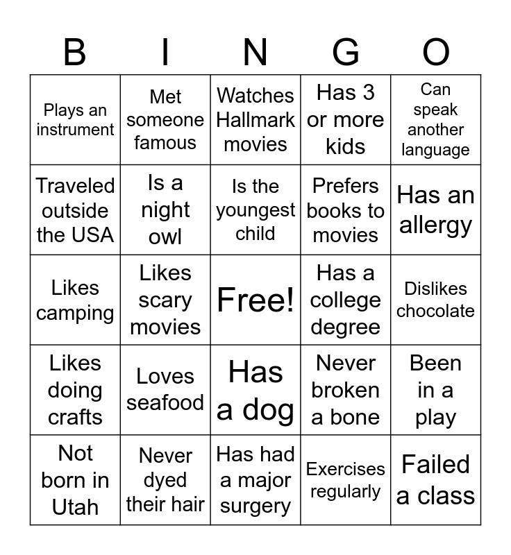This bingo card has a free space and 24 words: Loves seafood, Never dyed their hair, Is the youngest child, Not born in Utah, Can speak another language, Plays an instrument, Traveled outside the USA, Met someone famous, Has a college degree, Has a dog, Prefers books to movies, Likes camping, Never broken a bone, Been in a play, Is a night owl, Exercises regularly, Dislikes chocolate, Watches Hallmark movies, Has an allergy, Likes scary movies, Failed a class, Likes doing crafts, Has 3 or more kids and Has had a major surgery.