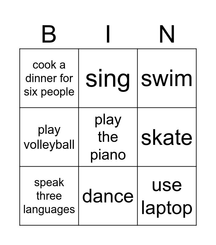 This bingo card has a free space and 8 words: skate, swim, sing, speak three languages, cook a dinner for six people, use laptop, play volleyball and dance.