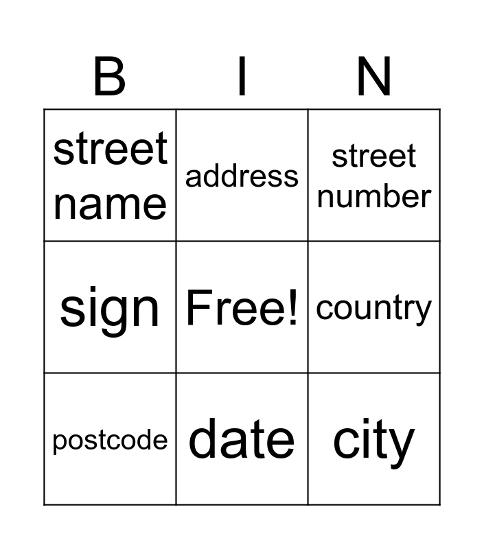 This bingo card has a free space and 16 words: first name, surname, street number, street name, date of birth, address, suburb, town, city, country, middle name, sign, signature, date, postcode and state.