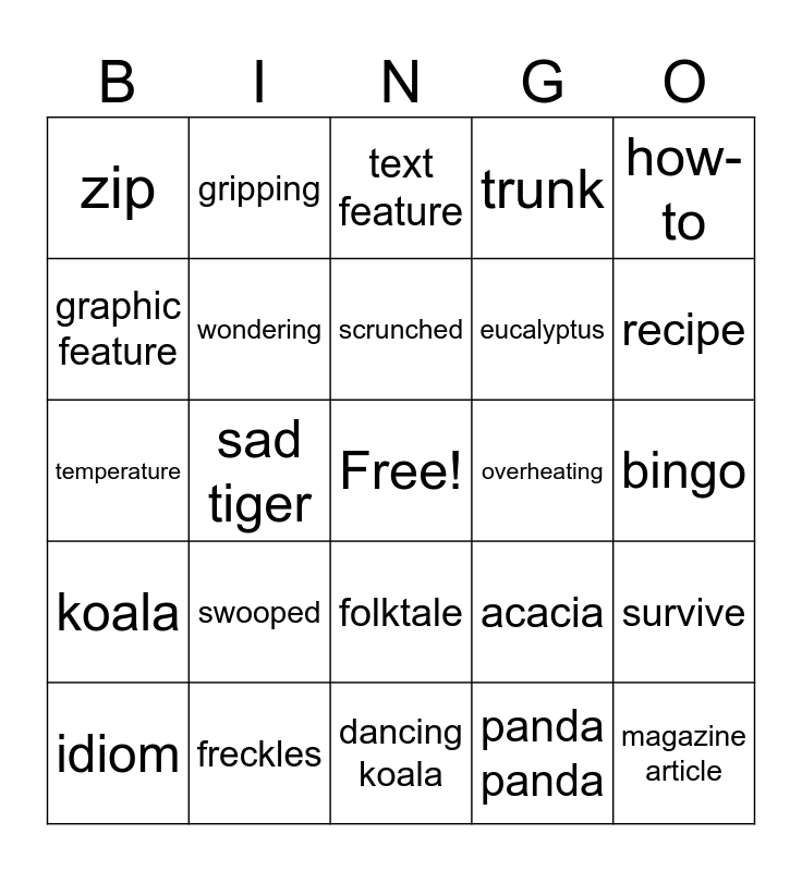 This bingo card has a free space and 27 words: acacia, polar bear, eucalyptus, dancing koala, graphic feature, text feature, gripping, koala, overheating, survive, temperature, trunk, idiom, freckles, recipe, whispered, wondering, scrunched, swooped, zip, bingo, panda panda, sad tiger, magazine article, folktale, how-to and realistic fiction.