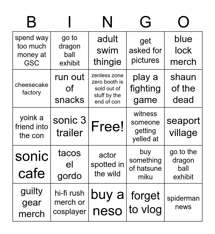 This bingo card has a free space and 24 words: tacos el gordo, hi-fi rush merch or cosplayer, zenless zone zero booth is sold out of stuff by the end of con, guilty gear merch, blue lock merch, spend way too much money at GSC, cheesecake factory, go to dragon ball exhibit, witness someone getting yelled at, actor spotted in the wild, play a fighting game, yoink a friend into the con, buy something of hatsune miku, go to the dragon ball exhibit, run out of snacks, forget to vlog, seaport village, adult swim thingie, shaun of the dead, sonic 3 trailer, spiderman news, sonic cafe, get asked for pictures and buy a neso.