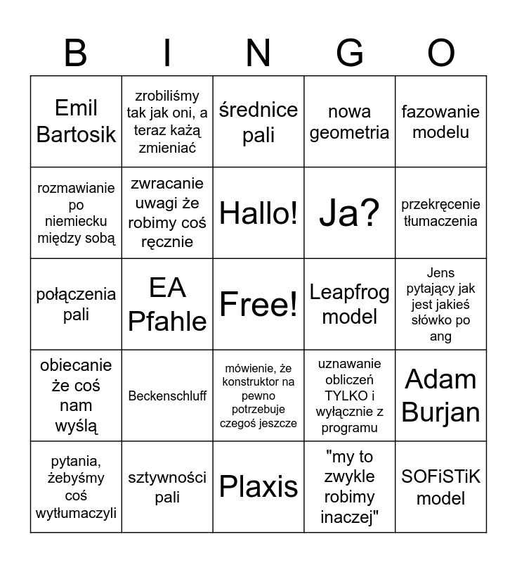 This bingo card has a free space and 24 words: Beckenschluff, sztywności pali, Hallo!, pytania, żebyśmy coś wytłumaczyli, fazowanie modelu, Emil Bartosik, rozmawianie po niemiecku między sobą, zrobiliśmy tak jak oni, a teraz każą zmieniać, Leapfrog model, mówienie, że konstruktor na pewno potrzebuje czegoś jeszcze, Ja?, połączenia pali, uznawanie obliczeń TYLKO i wyłącznie z programu, Adam Burjan, zwracanie uwagi że robimy coś ręcznie, "my to zwykle robimy inaczej", Jens pytający jak jest jakieś słówko po ang, średnice pali, przekręcenie tłumaczenia, EA Pfahle, SOFiSTiK model, obiecanie że coś nam wyślą, nowa geometria and Plaxis.