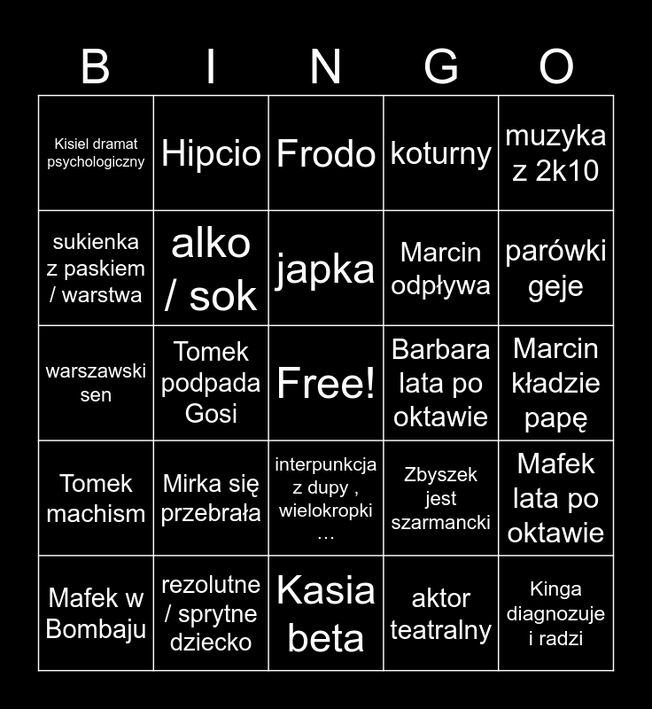 This bingo card has a free space and 35 words: picie z pustego, Molier, ktoś chodzi w butach po domu, alko / sok, interpunkcja z dupy , wielokropki …, koturny, sukienka z paskiem / warstwa, ktoś dzwoni, japka, prezenty, kwiaty itp., warszawski sen, muzyka z 2k10, senior odpędza złe, t-tutej?, Kisiel dramat psychologiczny, Barbara lata po oktawie, aktor teatralny, Tomek podpada Gosi, Tomek machism, Kinga diagnozuje i radzi, Zbyszek jest szarmancki, Mafek w Bombaju, Mafek lata po oktawie, rezolutne / sprytne dziecko, Frodo, parówki geje, kto zastępuje Hankę?, whimsical, Marcin odpływa, Marcin kładzie papę, Maczeta się wżyna, Kasia beta, Mirka się przebrała, Hipcio and Free!.