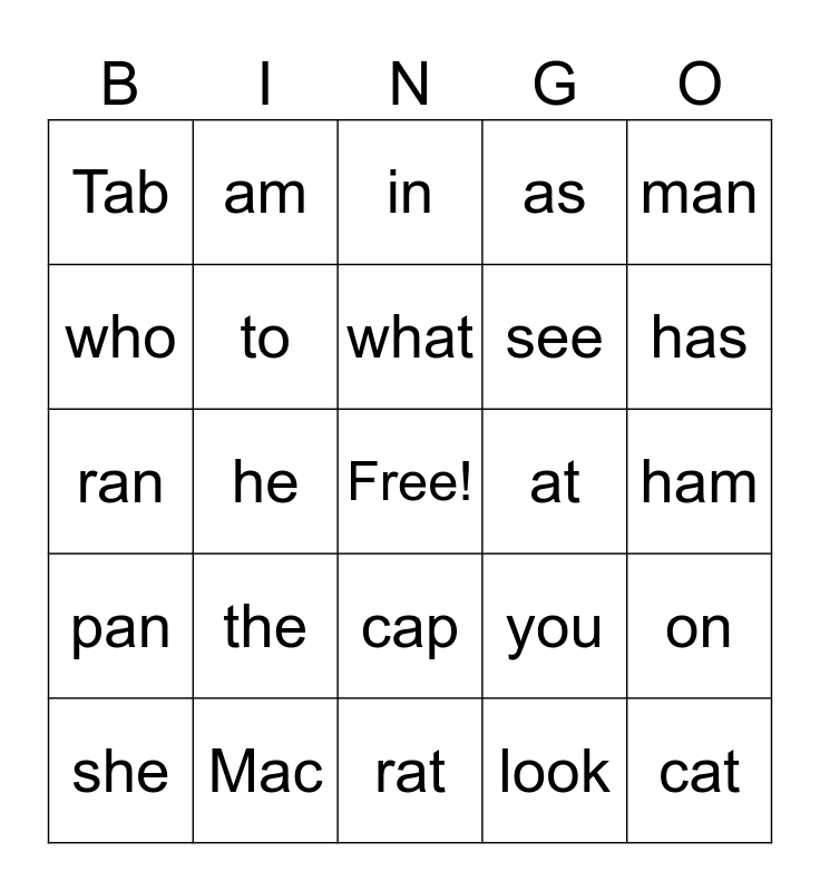 This bingo card has a free space and 24 words: the, Mac, what, she, man, Tab, who, am, at, cap, see, ran, you, on, to, look, ham, in, has, he, cat, pan, as and rat.