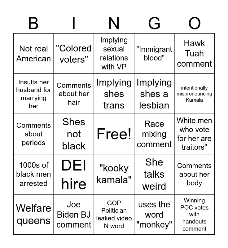This bingo card has a free space and 24 words: DEI hire, Joe Biden BJ comment, Implying shes trans, Welfare queens, Hawk Tuah comment, Not real American, Insults her husband for marrying her, "Colored voters", Race mixing comment, "kooky kamala", Implying shes a lesbian, Comments about periods, She talks weird, Comments about her body, Comments about her hair, uses the word "monkey", White men who vote for her are traitors", Implying sexual relations with VP, intentionally mispronouncing Kamala, Shes not black, Winning POC votes with handouts comment, 1000s of black men arrested, "Immigrant blood" and GOP Politician leaked video N word.