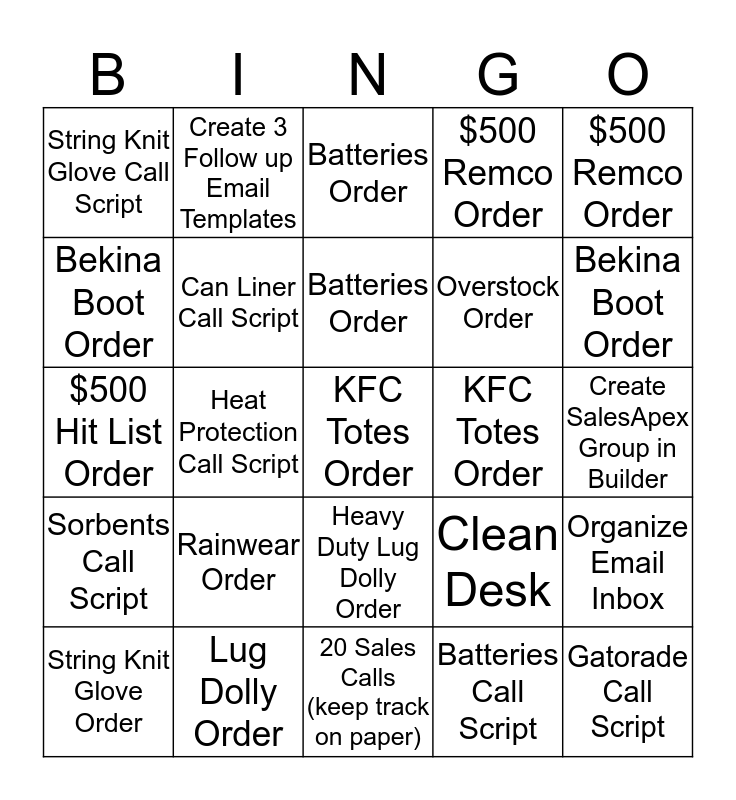 This bingo card has 25 words: Rainwear Order, 20 Sales Calls (keep track on paper), Batteries Order, String Knit Glove Order, $500 Remco Order, String Knit Glove Call Script, Bekina Boot Order, Create 3 Follow up Email Templates, KFC Totes Order, Heavy Duty Lug Dolly Order, Overstock Order, $500 Hit List Order, Clean Desk, Organize Email Inbox, Can Liner Call Script, Gatorade Call Script, Create SalesApex Group in Builder, Batteries Order, Bekina Boot Order, Heat Protection Call Script, KFC Totes Order, Lug Dolly Order, Sorbents Call Script, $500 Remco Order and Batteries Call Script.