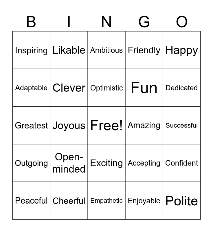 This bingo card has a free space and 24 words: Open-minded, Cheerful, Optimistic, Peaceful, Happy, Inspiring, Adaptable, Likable, Amazing, Exciting, Fun, Greatest, Accepting, Confident, Clever, Enjoyable, Successful, Ambitious, Dedicated, Joyous, Polite, Outgoing, Friendly and Empathetic.