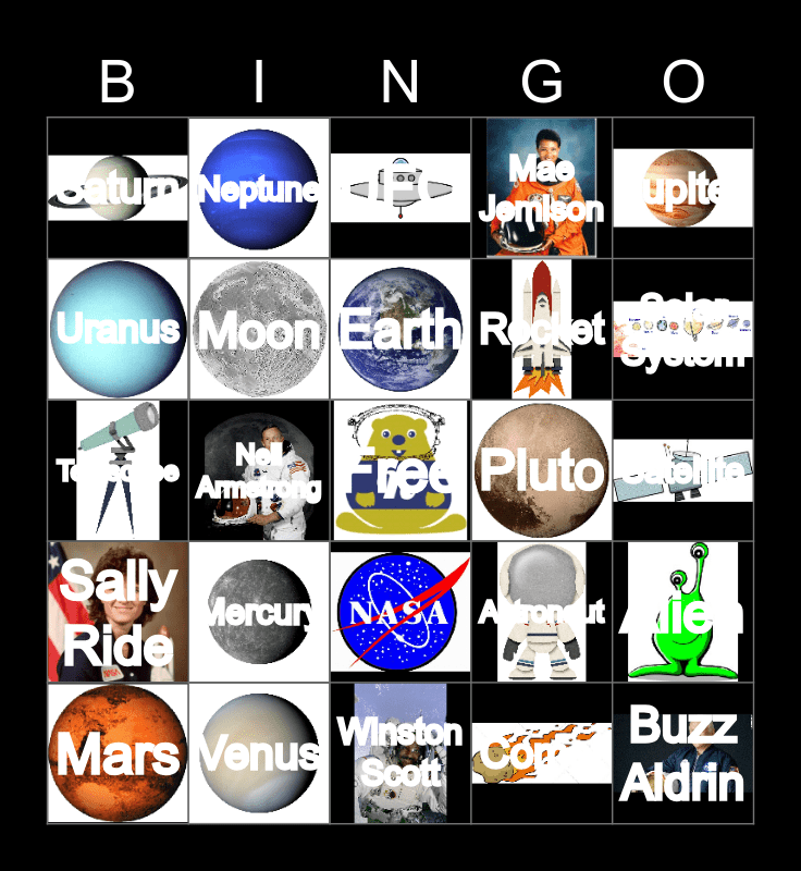 This bingo card has 24 images, a free space and 23 words: Mercury, Venus, Earth, Mars, Jupiter, Saturn, Uranus, Neptune, Pluto, Rocket, Telescope, Astronaut, Alien, Moon, Comet, Satellite, UFO, Solar System, Neil Armstrong, Buzz Aldrin, Sally Ride, Mae Jemison and Winston Scott.