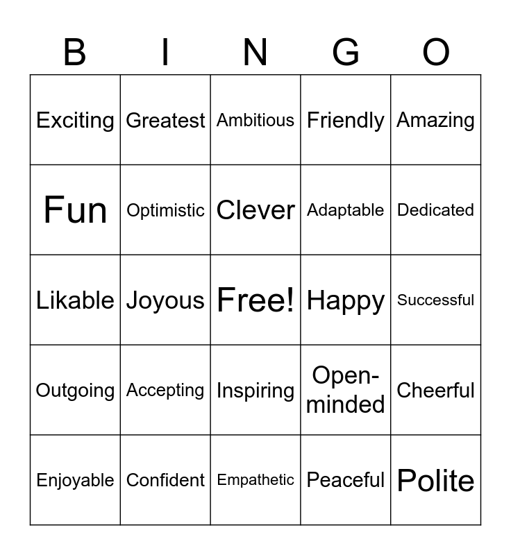 This bingo card has a free space and 24 words: Accepting, Confident, Clever, Enjoyable, Amazing, Exciting, Fun, Greatest, Happy, Inspiring, Adaptable, Likable, Open-minded, Cheerful, Optimistic, Peaceful, Successful, Ambitious, Dedicated, Joyous, Polite, Outgoing, Friendly and Empathetic.