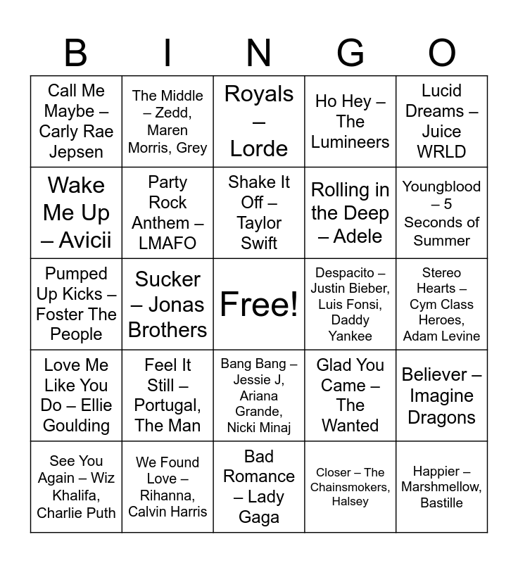 This bingo card has a free space and 60 words: My House – Flo Rida, We Found Love – Rihanna, Calvin Harris, Low – Flo Rida, T-pain, Love Me Like You Do – Ellie Goulding, Closer – The Chainsmokers, Halsey, Cheerleader – OMI, Felix Jaehn, Party Rock Anthem – LMAFO, Like a G6 – Far East Movement, Rolling in the Deep – Adele, Somebody That I Used to Know – Gotye, Kimbra, Ho Hey – The Lumineers, Sunflower – Post Malone, Swae Lee, Wake Me Up – Avicii, Forget You – CeeLo Green, Meant to Be – Bebe Rexha, Florida Georgia Line, Call Me Maybe – Carly Rae Jepsen, Happier – Marshmellow, Bastille, Lucid Dreams – Juice WRLD, Some Nights – fun., Shake It Off – Taylor Swift, Despacito – Justin Bieber, Luis Fonsi, Daddy Yankee, Royals – Lorde, See You Again – Wiz Khalifa, Charlie Puth, Believer – Imagine Dragons, Cheap Thrills – Sia, Sean Paul, High Hopes – Panic! At the Disco, Pompeii – Bastille, Stressed Out – Twenty One Pilots, Youngblood – 5 Seconds of Summer, Shut Up and Dance – WALK THE MOON, Lean On – Major Lazer, DJ Snake, One More Night – Maroon 5, Bad guy – Billie Eilish, Rude – MAGIC!, The Middle – Zedd, Maren Morris, Grey, Locked out of Heaven – Bruno Mars, Thunder – Imagine Dragons, Sucker – Jonas Brothers, Body Like a Back Road – Sam Hunt, Pumped Up Kicks – Foster The People, Safe and Sound – Capital Cities, Feel It Still – Portugal, The Man, Stereo Hearts – Cym Class Heroes, Adam Levine, Turn Down for What – DJ Snake, Lil Jon, Glad You Came – The Wanted, Cake By The Occean – DNCE, Blank Space – Taylor Swift, TiK ToK – Kesha, Raise Your Glass – P!nk, Bang Bang – Jessie J, Ariana Grande, Nicki Minaj, Bad Romance – Lady Gaga, Ex’s & Oh’s – Elle King, Tonight Tonight – Hot Chelle Rae, Best Day of My Life – America Authors, Young, Wild, & Free – Snoop Dogg, Wiz Khalifa, Bruno Mars, Riptide – Vance Joy, Not Over You – Gavin DeGraw, My Songs Know What You Did In The Dark – Fall Out Boy, Aint It Fun – Paramore and Renegades – X Ambassadors.