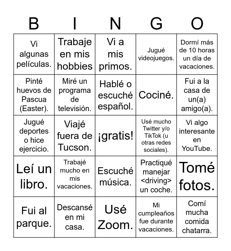 This bingo card has a free space and 24 words: Trabajé mucho en mis vacaciones., Descansé en mi casa., Hablé o escuché español., Fui al parque., Dormí más de 10 horas un día de vacaciones., Vi algunas películas., Pinté huevos de Pascua (Easter)., Trabaje en mis hobbies, Usé mucho Twitter y/o TikTok (u otras redes sociales)., Escuché música., Cociné., Jugué deportes o hice ejercicio., Practiqué manejar <driving> un coche., Tomé fotos., Miré un programa de televisión., Mi cumpleaños fue durante vacaciones., Vi algo interesante en YouTube., Vi a mis primos., Fui a la casa de un(a) amigo(a)., Viajé fuera de Tucson., Comí mucha comida chatarra., Leí un libro., Jugué videojuegos. and Usé Zoom..