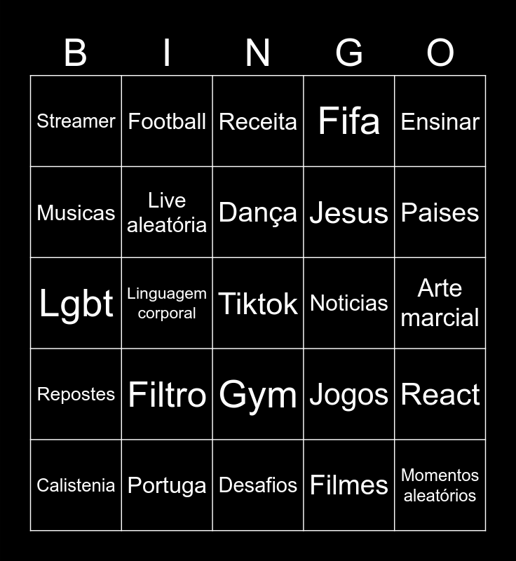This bingo card has a free space and 24 words: Filtro, Portuga, Dança, Calistenia, Ensinar, Streamer, Musicas, Football, Noticias, Gym, Jesus, Lgbt, Jogos, React, Live aleatória, Filmes, Arte marcial, Receita, Paises, Linguagem corporal, Momentos aleatórios, Repostes, Fifa and Desafios.