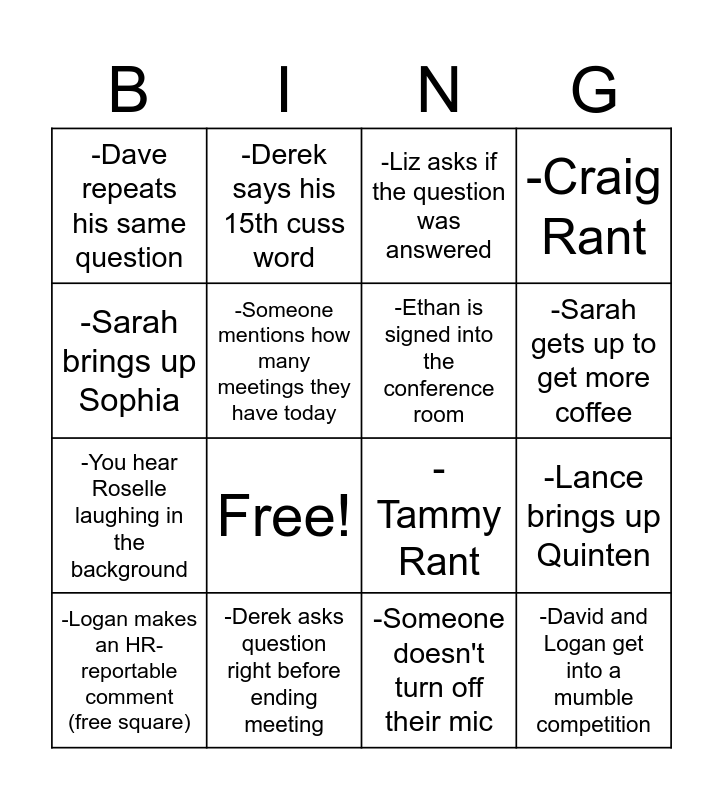 This bingo card has 18 words: Free!, -David and Logan get into a mumble competition, -Liz asks if the question was answered, -Dave repeats his same question, -Tammy Rant, -Craig Rant, -Logan makes an HR-reportable comment (free square), -Derek says his 15th cuss word, -Sarah gets up to get more coffee, -You hear Roselle laughing in the background, -Someone doesn't turn off their mic, -Sarah brings up Sophia, -Lance brings up Quinten, -Someone mentions how many meetings they have today, -Ethan is signed into the conference room, -Ethan browsing on his phone, -Derek asks question right before ending meeting and Logan shows up late with tacos.