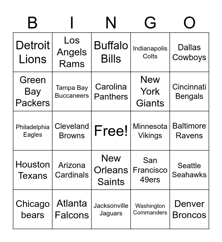 This bingo card has a free space and 24 words: Arizona Cardinals, Atlanta Falcons, Carolina Panthers, Chicago bears, Dallas Cowboys, Detroit Lions, Green Bay Packers, Los Angels Rams, Minnesota Vikings, New Orleans Saints, New York Giants, Philadelphia Eagles, San Francisco 49ers, Seattle Seahawks, Tampa Bay Buccaneers, Washington Commanders, Baltimore Ravens, Buffalo Bills, Cincinnati Bengals, Cleveland Browns, Denver Broncos, Houston Texans, Indianapolis Colts and Jacksonville Jaguars.