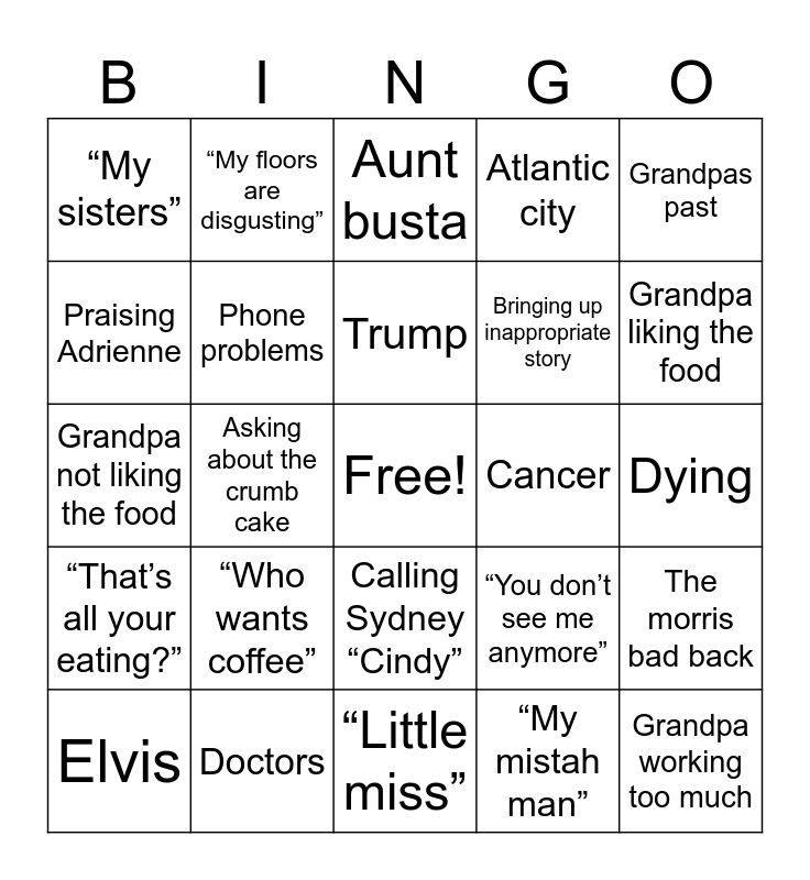 This bingo card has a free space and 24 words: Elvis, “Who wants coffee”, Trump, “My mistah man”, Grandpas past, “My sisters”, “My floors are disgusting”, Aunt busta, Cancer, Dying, Grandpa not liking the food, Phone problems, “You don’t see me anymore”, The morris bad back, Praising Adrienne, Doctors, “Little miss”, Atlantic city, Grandpa liking the food, “That’s all your eating?”, Asking about the crumb cake, Calling Sydney “Cindy”, Bringing up inappropriate story and Grandpa working too much.