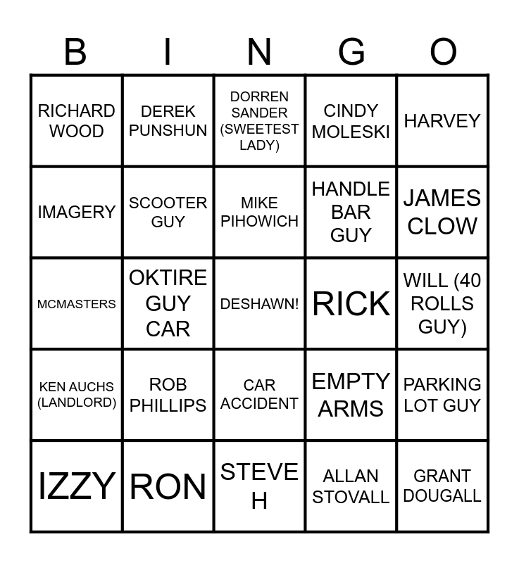 This bingo card has a free space and 24 words: ROB PHILLIPS, RON, MIKE PIHOWICH, IZZY, HARVEY, RICHARD WOOD, IMAGERY, DEREK PUNSHUN, RICK, CAR ACCIDENT, HANDLE BAR GUY, MCMASTERS, EMPTY ARMS, PARKING LOT GUY, SCOOTER GUY, ALLAN STOVALL, WILL (40 ROLLS GUY), DORREN SANDER (SWEETEST LADY), JAMES CLOW, OKTIRE GUY CAR, GRANT DOUGALL, KEN AUCHS (LANDLORD), CINDY MOLESKI and STEVE H.