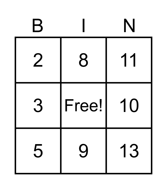 This bingo card has a free space and 14 words: 1, 6, 10, 2, 11, 3, 7, 12, 4, 8, 13, 5, 9 and 14.