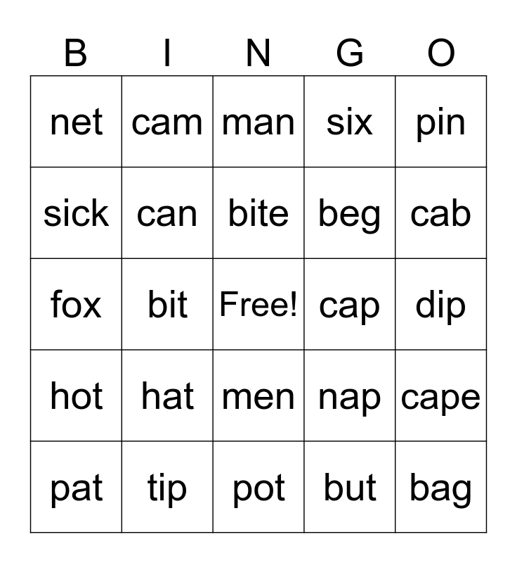 This bingo card has a free space and 29 words: pat, sock, bit, fix, net, man, can, hat, cap, tip, dip, bag, pot, but, cab, fit, men, hot, pin, fox, nap, top, beg, sick, six, cam, cape, bite and pine.