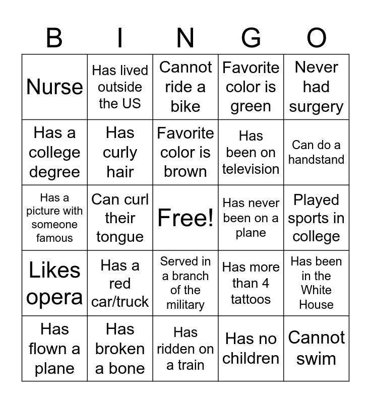 This bingo card has a free space and 26 words: Served in a branch of the military, Has no children, Favorite color is brown, Has broken a bone, Never had surgery, Nurse, Has a college degree, Has lived outside the US, Played sports in college, Has more than 4 tattoos, Has been on television, Has a picture with someone famous, Has been in the White House, Has flown a plane, Can curl their tongue, Plays an instrument, Favorite color is green, Likes opera, Cannot ride a bike, Cannot swim, Can do a handstand, Has ridden on a train, Has never been on a plane, Has a red car/truck, Has curly hair and Is bald.