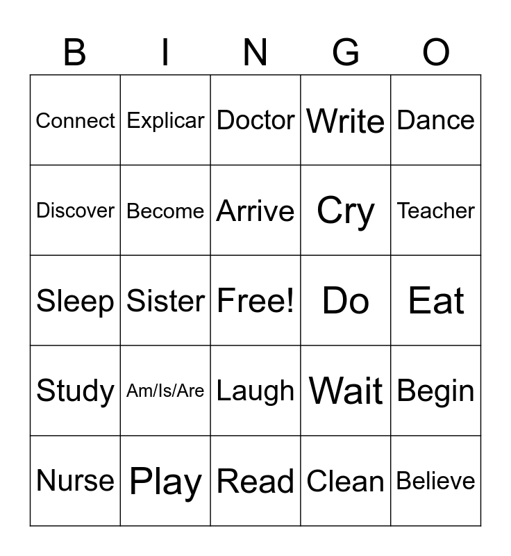 This bingo card has a free space and 24 words: Am/Is/Are, Play, Arrive, Nurse, Dance, Connect, Discover, Explicar, Do, Laugh, Cry, Sleep, Wait, Begin, Become, Clean, Eat, Doctor, Teacher, Sister, Believe, Study, Write and Read.