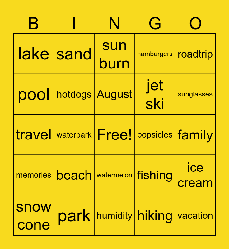This bingo card has a free space and 50 words: summertime, vacation, sun, humidity, beach, cookout, sand, hammock, pool, umbrella, hotdogs, hamburgers, ice cream, fishing, sprinkler, July, August, popsicles, relax, roadtrip, waterpark, hiking, lake, jet ski, boat, sunscreen, sunglasses, sun hat, sun burn, watermelon, friends, sweat, swimsuit, games, park, camping, bonfire, sandcastle, canoeing, family, strawberries, pineapple, lemonade, kite, snow cone, travel, fireflies, biking, memories and out doors.