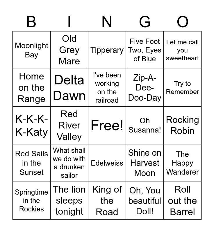 This bingo card has a free space and 35 words: Bring Back My Bonnie To Me, By the light of the Silvery Moon, Clementine, Delta Dawn, Edelweiss, Five Foot Two, Eyes of Blue, Home on the Range, I walk the line, I've been working on the railroad, Jambalaya, K-K-K-K-Katy, Let me call you sweetheart, Love me Tender, Magic Penny, Moonlight Bay, Oh Susanna!, Oh, You beautiful Doll!, Red River Valley, Red Sails in the Sunset, Roll out the Barrel, Shine on Harvest Moon, Springtime in the Rockies, The Happy Wanderer, The lion sleeps tonight, Tipperary, Try to Remember, When Irish Eyes are Smiling, You are my Sunshine, Zip-A-Dee-Doo-Day, Rocking Robin, Those were the Days, King of the Road, What shall we do with a drunken sailor, Old Grey Mare and Amore.