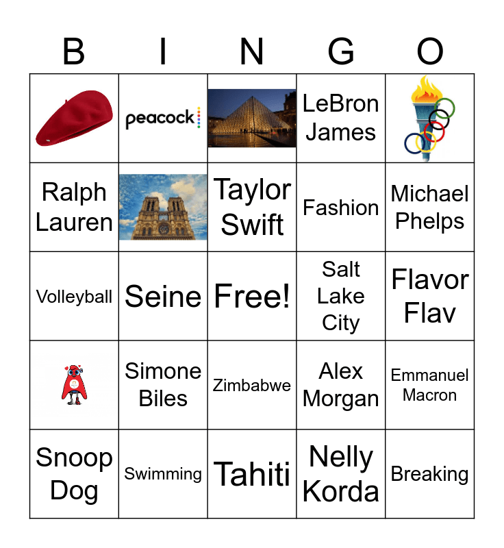 This bingo card has 7 images, a free space and 22 words: Snoop Dog, Rivalry, Seine, Simone Biles, Salt Lake City, Swimming, Flavor Flav, Breaking, Tahiti, Nelly Korda, Michael Phelps, Sha'Carri Richardson, Zimbabwe, Volleyball, Alex Morgan, Caitlin Clark, Fashion, Ralph Lauren, LeBron James, Emmanuel Macron, Taylor Swift and relay.
