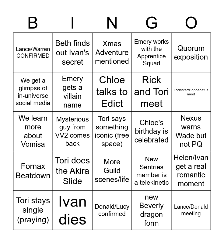 This bingo card has a free space and 50 words: Lance/Ren meeting, Lance/Donald meeting, Beverly/Austin confirmed, Donald/Lucy confirmed, Tori does the Akira Slide, Donald meets a Guild member, Beth finds out Ivan's secret, Assassination attempt on Tori, We get a glimpse of in-universe social media, Aliens picked up Ike, Emery gets a villain name, Emery works with the Apprentice Squad, Helen/Ivan get a real romantic moment, New Sentries member is a telekinetic, New Sentries member is lab-grown, New Sentries member is a girl, Chloe talks to Edict, Chloe's birthday is celebrated, More last names revealed, Quorum exposition, Mysterious guy from VV2 comes back, new Beverly dragon form, Lance/Warren CONFIRMED, Rick and Tori meet, Penelope and Tori meet, Tori accidentally sets something on fire, Lodestar/Hephaestus meet, Hallowville mentioned, Xmas Adventure mentioned, More Guild scenes/life, Xelas is interested in Tori's work, Wade and Tori on another show, Lodestar mantle gets changed, Helen dies, Ivan dies, One of the Rookie Squad dies, One of the Apprentice Squad dies, A Council member dies, Faithful kills Lodestar, Nexus warns Wade but not PQ, Nexus warns PQ but not Wade, One of the Sentries dies, Apollo's back as a Corpie, Chloe gets a girlfriend, Tori stays single (praying), We learn more about Vomisa, PQ DIES (🎉), The Gang kills a Nexus, Fornax Beatdown and Whitest Knight shows up again.